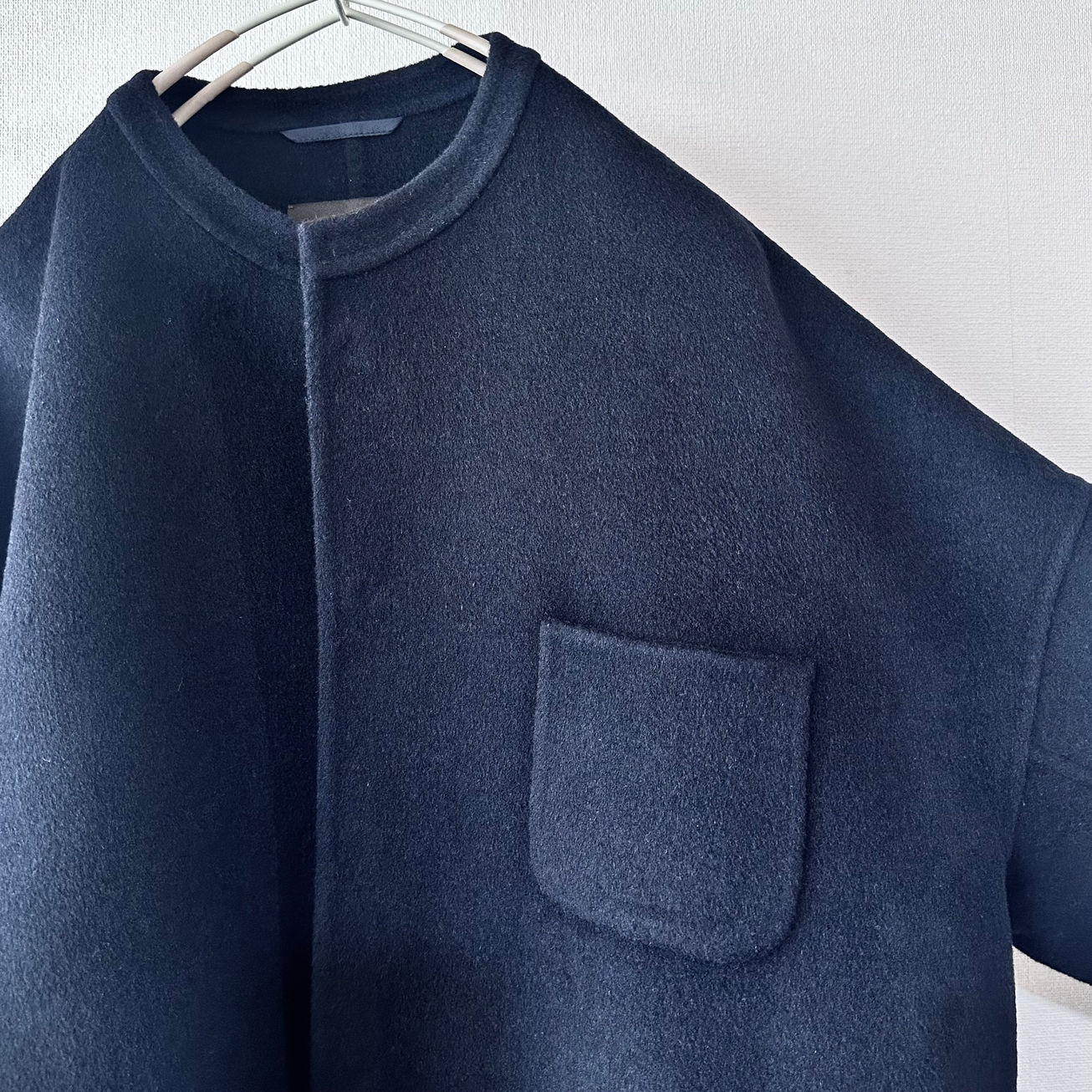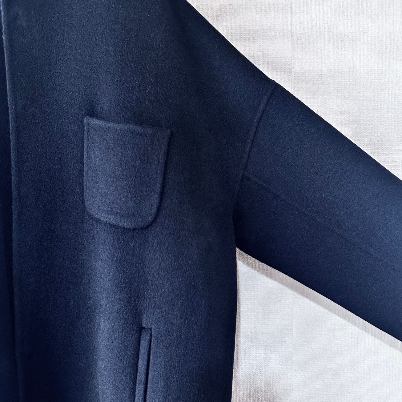 二重織りのコート素材。短い毛並みのあるビーバー仕上げで、とてもなめらかで艶があります。縫い代を内側に縫い込んで一重仕立てにしました。さっと羽織れるように袖のみ裏地付き。すっきりシンプルなノーカラー。ワーク系カジュアルがお好きな方から お仕事やお出かけ用にお探しの方まで 幅広く着られるフレキシブルなデザインです。